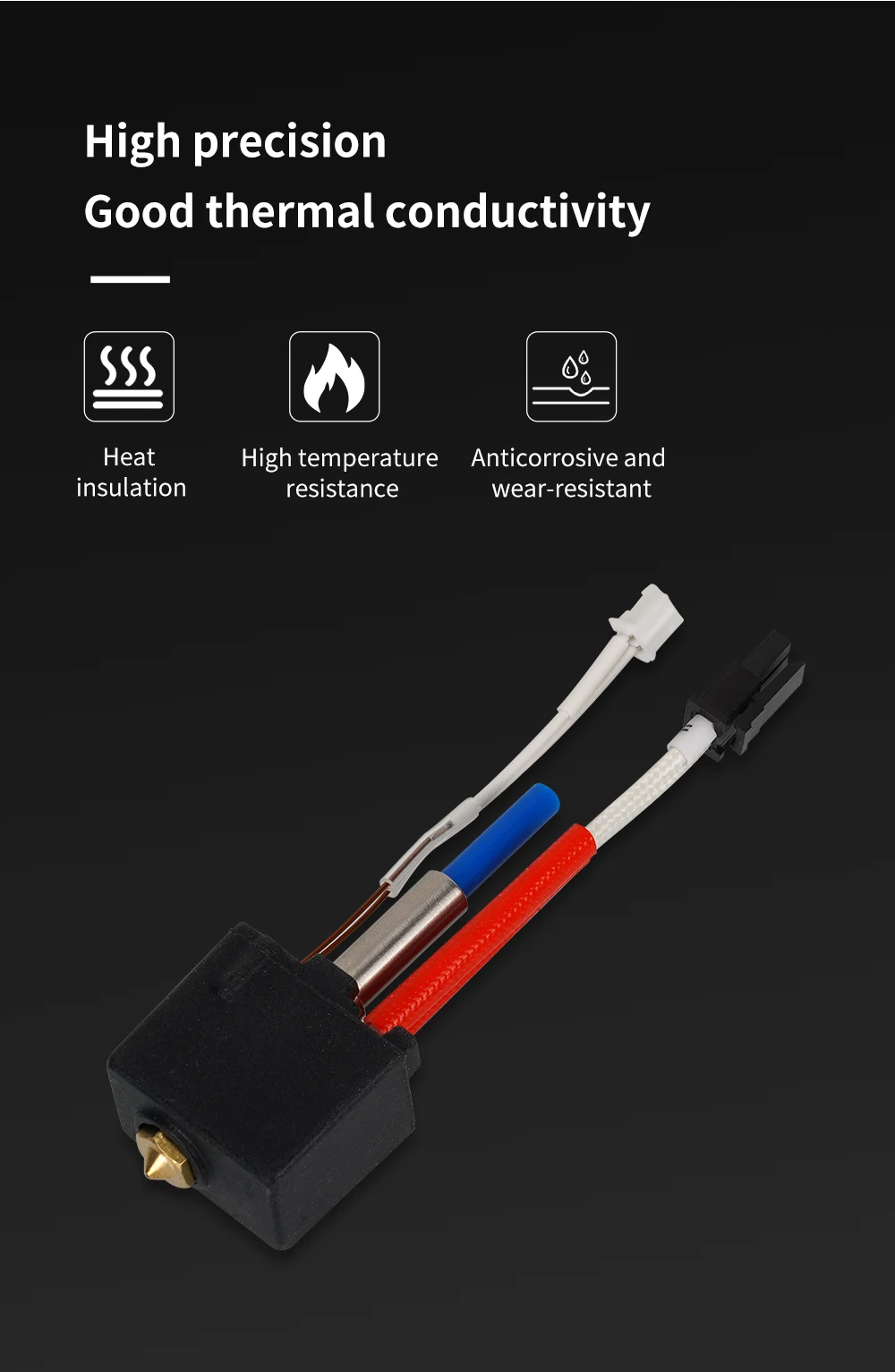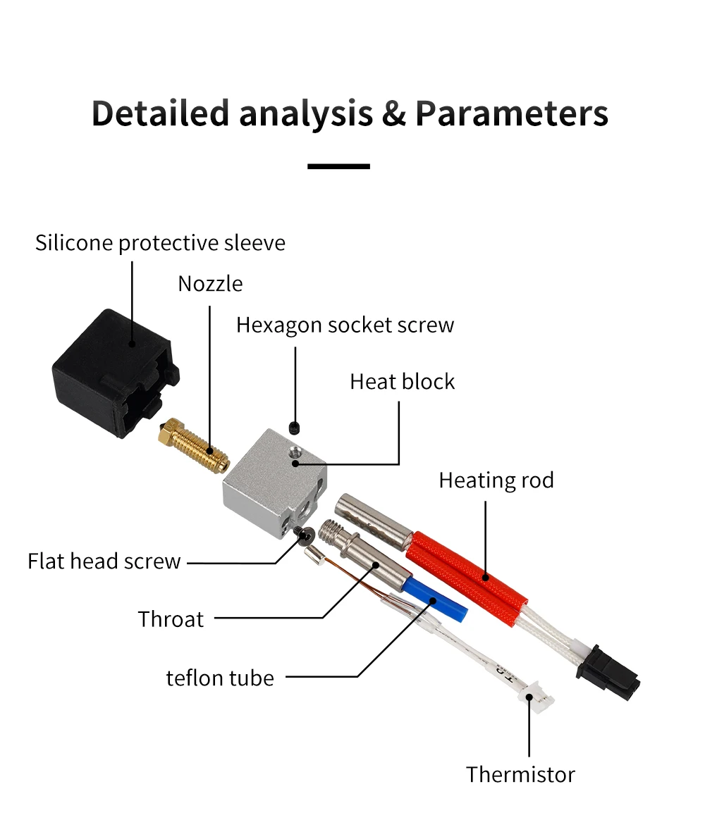 - 【Package Included】5PCS silicone cover + 5PC 0.4mm Brass Nozzle + 1 set hotend kit (heater cartridge, thermistor, heat block,throat tube, nozzle) + 1PC Allen wrench
