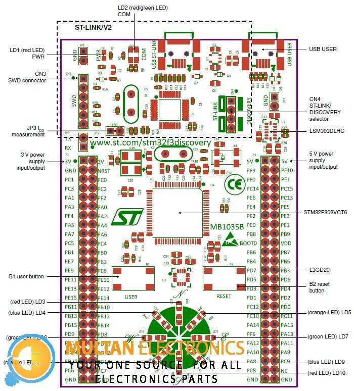 Based on the STM32F303VCT6, it includes an ST-LINK/V2 or ST-LINK/V2-B embedded debug tool, accelerometer, gyroscope and e-compass ST MEMS, USB connection, LEDs and push-buttons.